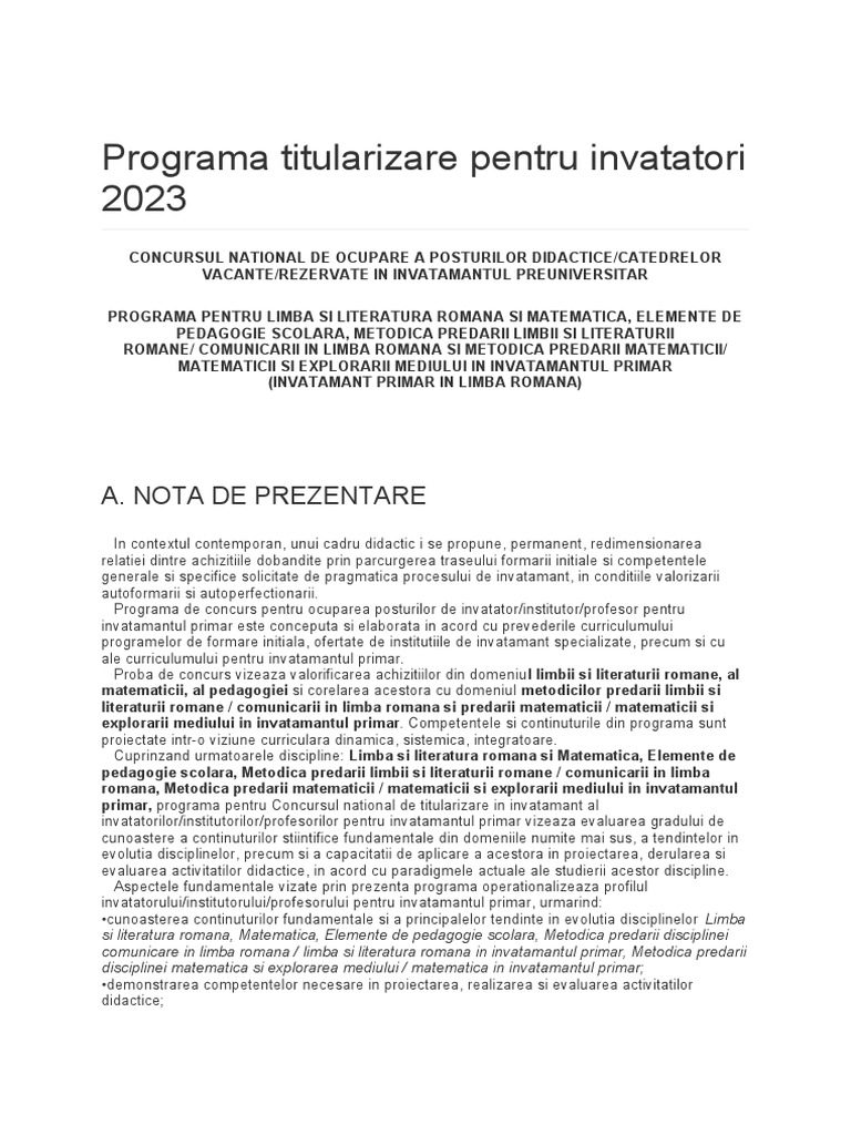 primar, programa pentru Concursul national de titularizare in invatamant al
