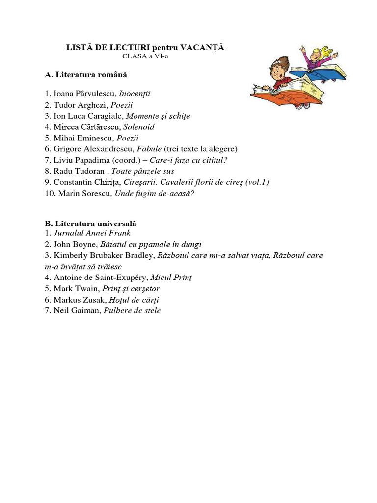 LISTĂ DE LECTURI pentru VACANȚĂ