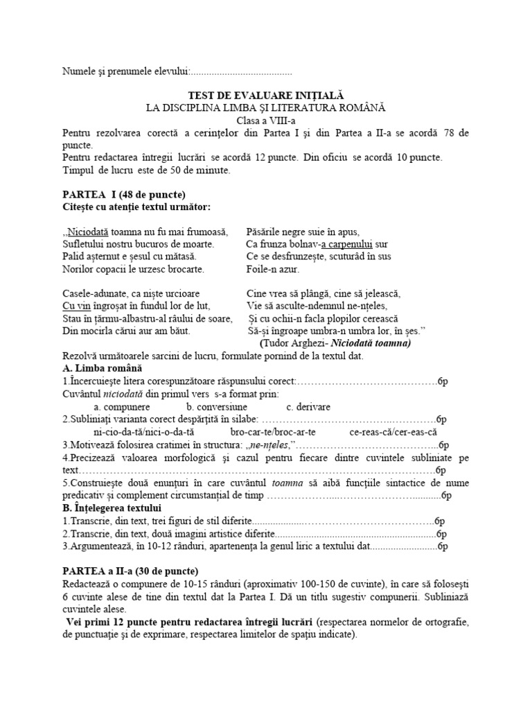 Pentru redactarea întregii lucrări se acordă 12 puncte. Din oficiu se acordă 10 puncte.