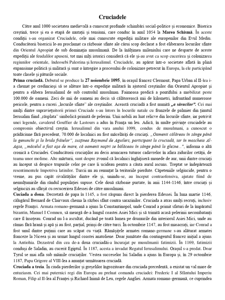 Prima cruciadă. Debutul se produce la 27 noiembrie 1095, în oraşul francez Clermont, Papa Urban al II-lea i-