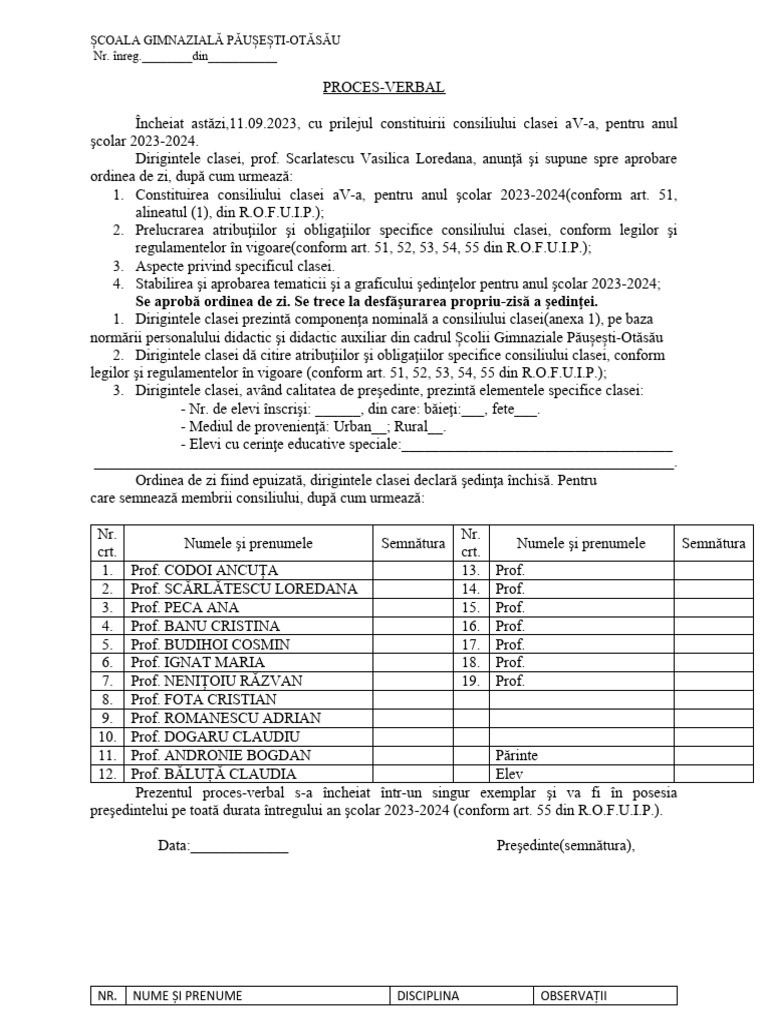 1. Constituirea consiliului clasei aV-a, pentru anul şcolar 2023-2024(conform art. 51,