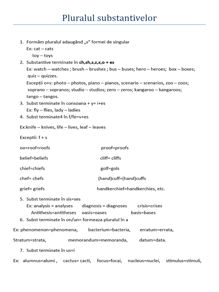 Excepții o+s: photo – photos, piano – pianos, scenario – scenarios, zoo – zoos;