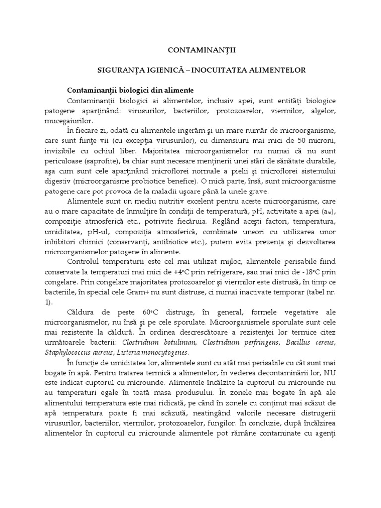 t entiti biologice patogene aparinnd: virusurilor, bacteriilor, protozoarelor, viermilor, algelor, mucegaiurilor. n fiecare zi, odat cu alimentele ingerm i un mare numr de microorganisme, care sunt fiine vii (cu excepia virusurilor), cu dimensiuni mai mici de 50 microni, invizibile cu ochiul liber. Majoritatea microorganismelor nu numai c nu sunt periculoase (saprofite), ba chiar sunt necesare meninerii unei stri de sntate durabile, aa cum sunt cele aparinnd microflorei normale a pielii i microflorei sistemului digestiv (microorganisme probiotice benefice). O mic parte, ns, sunt microorganisme patogene care pot provoca de la maladii uoare pn la unele grave. Alimentele sunt un mediu nutritiv excelent pentru aceste microorganisme, care au o mare capacitate de nmulire n condiii de temperatur, pH, activitate a apei (aw), compoziie atmosferic etc., potrivite fiecruia. Reglnd aceti factori, temperatura, umiditatea, pH-ul, compoziia atmosferic, combinate uneori cu utilizarea unor inhibitori chimici (conservani, antibiotice etc.), putem evita prezena i dezvoltarea microorganismelor patogene n alimente. Controlul temperaturii este cel mai utilizat mijloc, alimentele perisabile fiind conservate la temperaturi mai mici de +4oC prin refrigerare, sau mai mici de -18oC prin congelare. Prin congelare majoritatea protozoarelor i viermilor este distrus, n timp ce bacteriile, n special cele Gram+ nu sunt distruse, ci numai inactivate temporar (tabel nr. 1). Cldura de peste 60oC distruge, n general, formele vegetative ale microorganismelor, nu ns i pe cele sporulate. Microorganismele sporulate sunt cele mai rezistente la cldur. n ordinea descresctoare a rezistenei lor termice citez urmtoarele bacterii: Clostridium botulinum, Clostridium perfringens, Bacillus cereus, Staphylococcus aureus, Listeria monocytogenes. n funcie de umiditatea lor, alimentele sunt cu att mai perisabile cu ct sunt mai bogate n ap. Pentru tratarea termic a alimentelor, n vederea decontaminrii lor, NU este indicat cuptorul cu microunde. Alimentele nclzite la cuptorul cu microunde nu au temperaturi egale n toat masa produsului. n zonele mai bogate n ap ale alimentului temperatura este mai ridicat, pe cnd n zonele cu coninut mai sczut de ap temperatura poate fi mai sczut, neatingnd valorile necesare distrugerii virusurilor, bacteriilor, viermilor, protozoarelor, fungilor. n concluzie, dup nclzirea alimentelor n cuptorul cu microunde alimentele pot rmne contaminate cu ageni