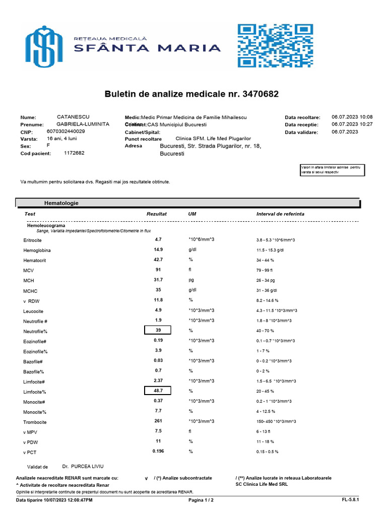 Nume: CATANESCU Medic:Medic Primar Medicina de Familie Mihailescu Data recoltare: 06.07.2023 10:08