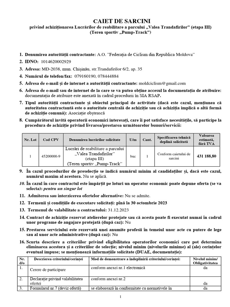 1. Denumirea autorității contractante: A.O. ”Federația de Ciclism din Republica Moldova”