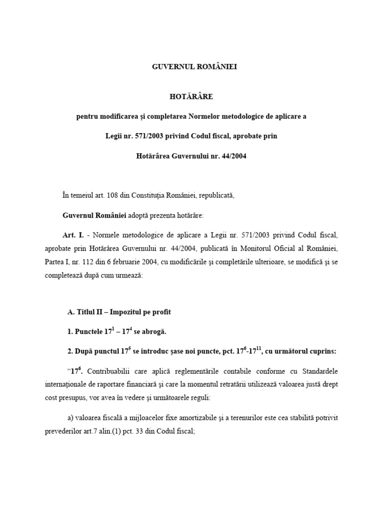 Art. I. - Normele metodologice de aplicare a Legii nr. 571/2003 privind Codul fiscal,