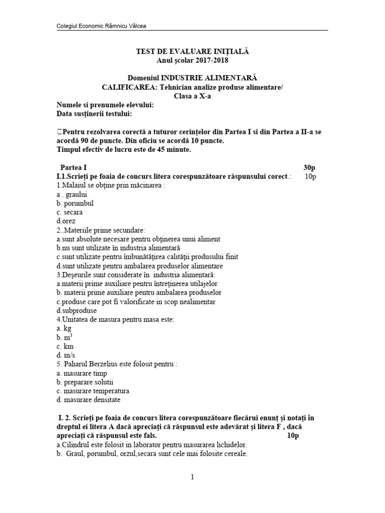 I. 2. Scrieţi pe foaia de concurs litera corespunzătoare fiecărui enunţ şi notaţi în