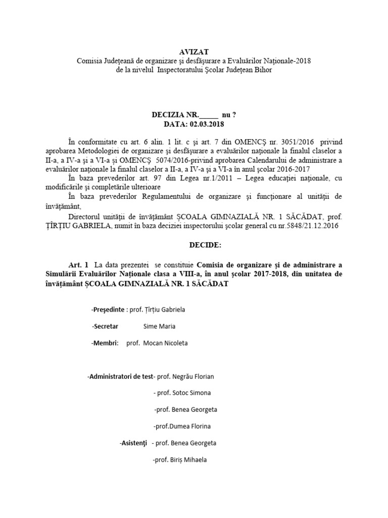 Comisia Judeţeană de organizare şi desfăşurare a Evaluărilor Naţionale-2018