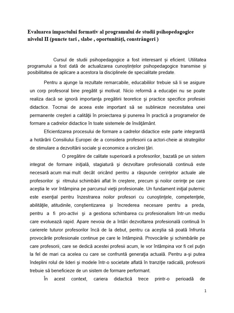 Evaluarea impactului formativ al programului de studii psihopedagogice