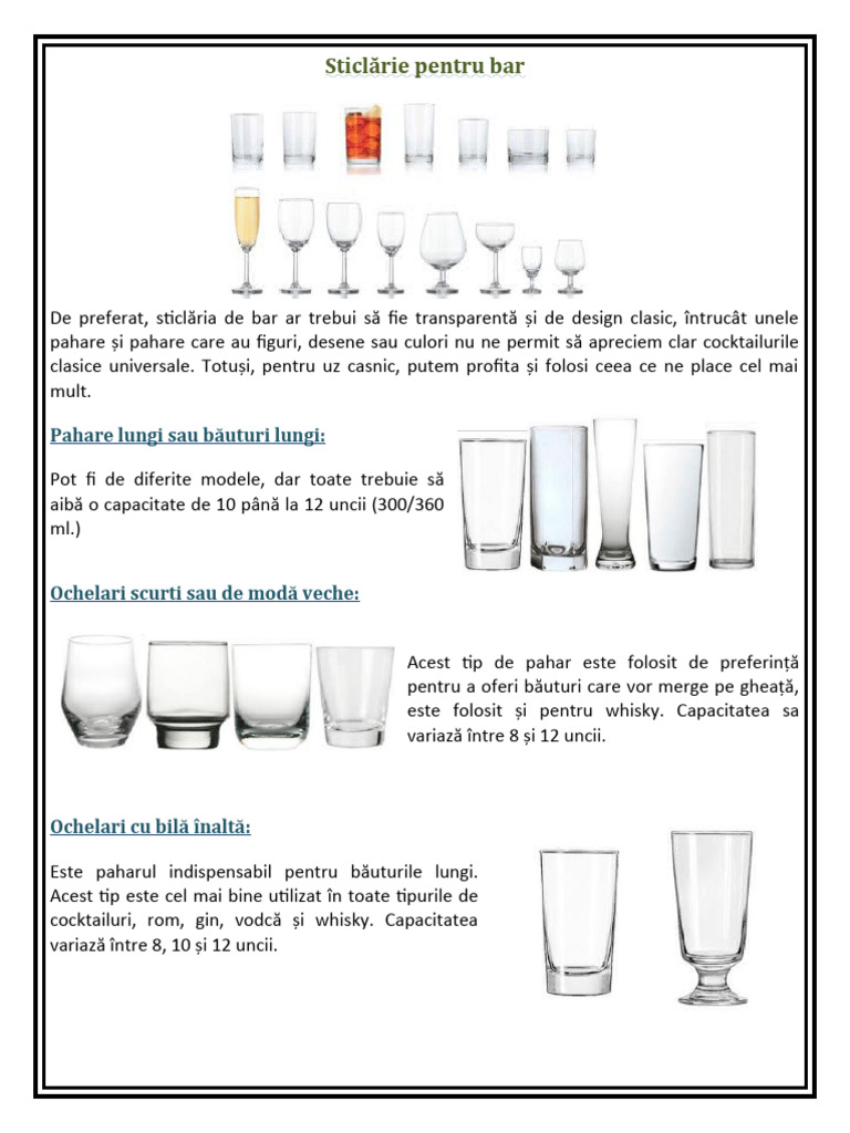 De preferat, sticlăria de bar ar trebui să fie transparentă și de design clasic, întrucât unele