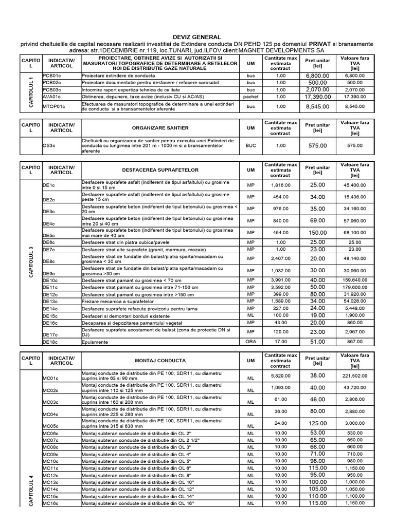 privind cheltuielile de capital necesare realizarii investitiei de Extindere conducta DN PEHD 125 pe domeniul PRIVAT si bransamente