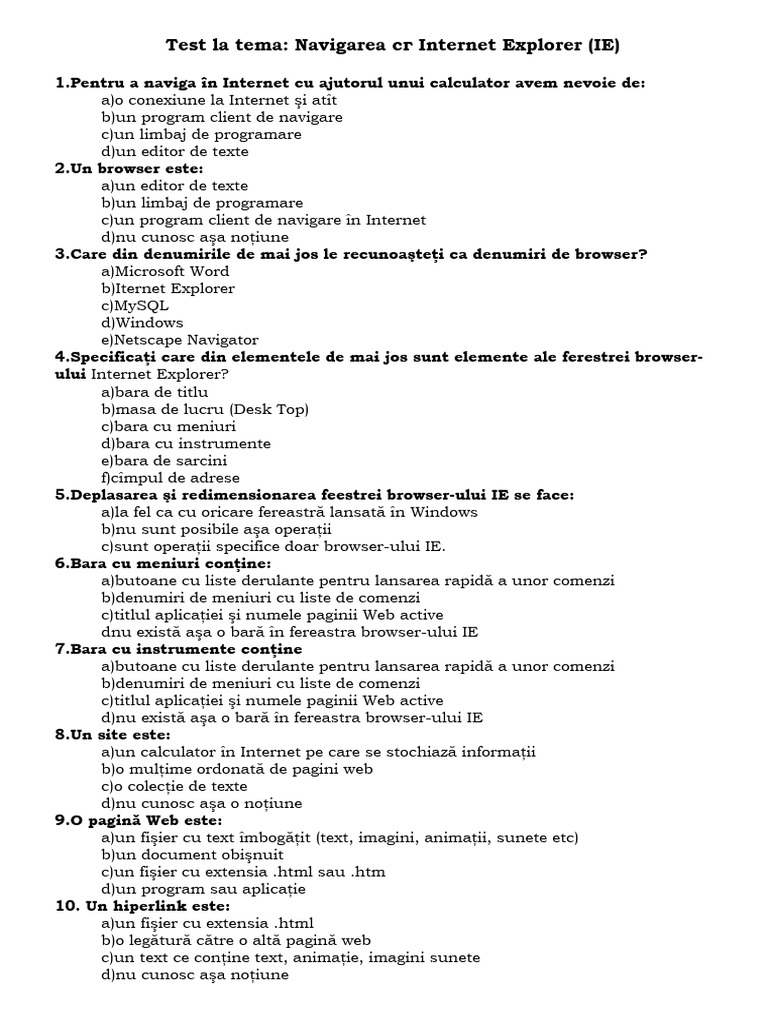 Test la tema: Navigarea сг Internet Explorer (IE)