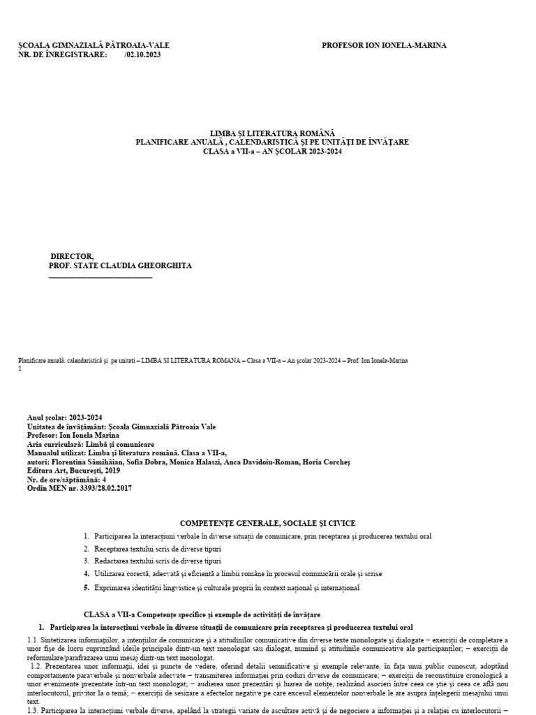 Planificare Anuală, Calendaristică Şi Pe Unitati - LIMBA SI LITERATURA ROMANA - Clasa A VII-a - An Şcolar 2023-2024 - Prof. Ion Ionela-Marina 1