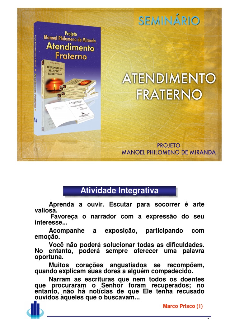 O ATENDENTE MOSTRA POSSVEIS SOLUES Informando os recursos que o Centro Esprita oferece Informando sobre outras portas alm do Centro Esprita Valorando atitudes e projetos de vida cogitados pelo atendido, alertando-o ou estimulando-o O ATENDIDO DECIDE, MOVIMENTA-SE E AGE Se personalizar definir o onde, orientar determinar o como