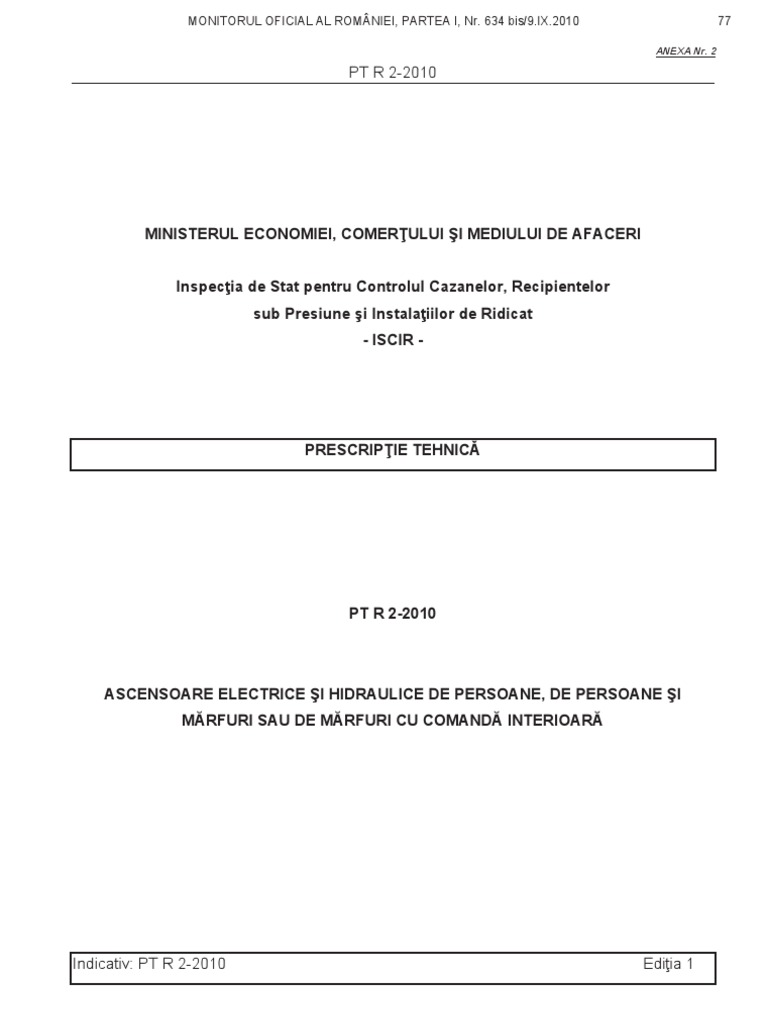 PT R 2-2010 CAPITOLUL I GENERALIT SEC IUNEA 1 Scop Art. 1 (1) Prezenta prescrip ie tehnic autorizarea electrice interioar . (2) Prevederile prezentei prescrip ii tehnice se aplic doar n m sura n care nu exist alte dispozi ii specifice (cu acela i obiectiv) n legisla ia comunitar de armonizare. Art. 2 Ascensoarele electrice i hidraulice de persoane, de persoane i m rfuri sau de func ion rii, supravegherea stabile te condi iile i verificarea i cerin ele tehnice pentru n utilizare pentru i repararea ascensoarelor I