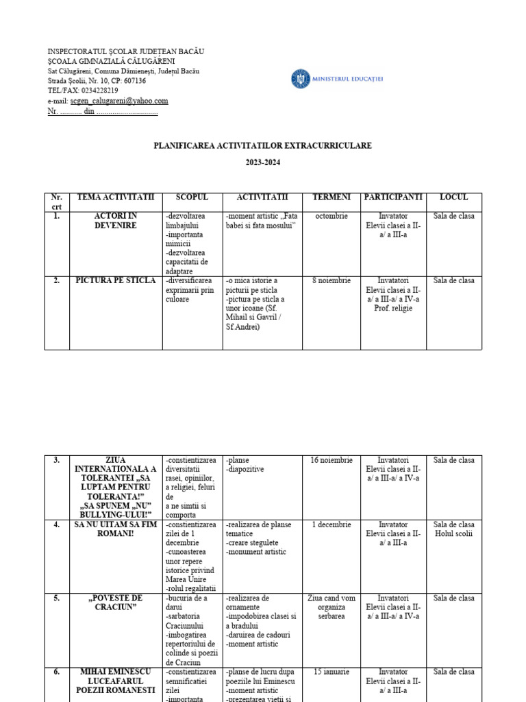 PLANIFICAREA ACTIVITATILOR EXTRACURRICULARE
