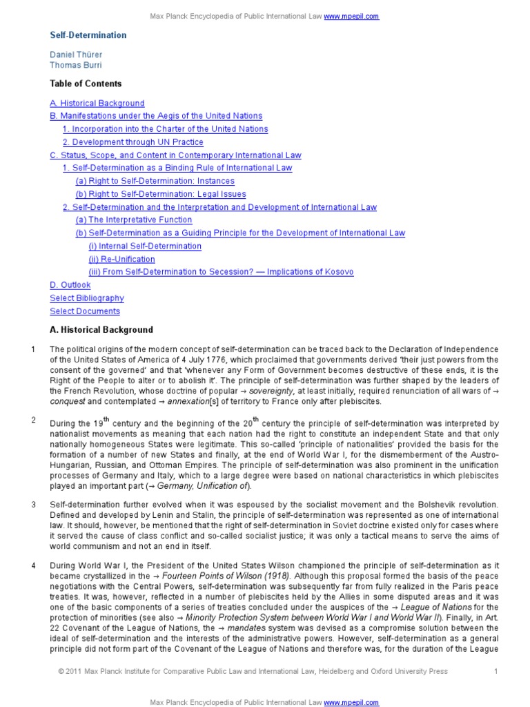 Self-Determination Daniel Threr Thomas Burri Table of Contents A. Historical Background B. Manifestations under the Aegis of the United Nations 1. Incorporation into the Charter of the United Nations 2. Development through UN Practice C. Status, Scope, and Content in Contemporary International Law 1. Self-Determination as a Binding Rule of International Law (a) Right to Self-Determination: Instances (b) Right to Self-Determination: Legal Issues 2. Self-Determination and the Interpretation and Development of International Law (a) The Interpretative Function (b) Self-Determination as a Guiding Principle for the Development of International Law (i) Internal Self-Determination (ii) Re-Unification (iii) From Self-Determination to Secession? Implications of Kosovo D. Outlook Select Bibliography Select Documents A. Historical Background The political origins of the modern concept of self-determination can be traced back to the Declaration of Independence of the United States of America of 4 July 1776, which proclaimed that governments derived their just powers from the consent of the governed and that whenever any Form of Government becomes destructive of these ends, it is the Right of the People to alter or to abolish it. The principle of self-determination was further shaped by the leaders of the French Revolution, whose doctrine of popular sovereignty, at least initially, required renunciation of all wars of conquest and contemplated annexation[s] of territory to France only after plebiscites. During the 19 century and the beginning of the 20 century the principle of self-determination was interpreted by nationalist movements as meaning that each nation had the right to constitute an independent State and that only nationally homogeneous States were legitimate. This so-called principle of nationalities provided the basis for the formation of a number of new States and finally, at the end of World War I, for the dismemberment of the AustroHungarian, Russian, and Ottoman Empires. The principle of self-determination was also prominent in the unification processes of Germany and Italy, which to a large degree were based on national characteristics in which plebiscites played an important part ( Germany, Unification of). Self-determination further evolved when it was espoused by the socialist movement and the Bolshevik revolution. Defined and developed by Lenin and Stalin, the principle of self-determination was represented as one of international law. It should, however, be mentioned that the right of self-determination in Soviet doctrine existed only for cases where it served the cause of class conflict and so-called socialist justice; it was only a tactical means to serve the aims of world communism and not an end in itself. During World War I, the President of the United States Wilson championed the principle of self-determination as it became crystallized in the Fourteen Points of Wilson (1918). Although this proposal formed the basis of the peace negotiations with the Central Powers, self-determination was subsequently far from fully realized in the Paris peace treaties. It was, however, reflected in a number of plebiscites held by the Allies in some disputed areas and it was one of the basic components of a series of treaties concluded under the auspices of the League of Nations for the protection of minorities (see also Minority Protection System between World War I and World War II). Finally, in Art. 22 Covenant of the League of Nations, the mandates system was devised as a compromise solution between the ideal of self-determination and the interests of the administrative powers. However, self-determination as a general principle did not form part of the Covenant of the League of Nations and therefore was, for the duration of the League