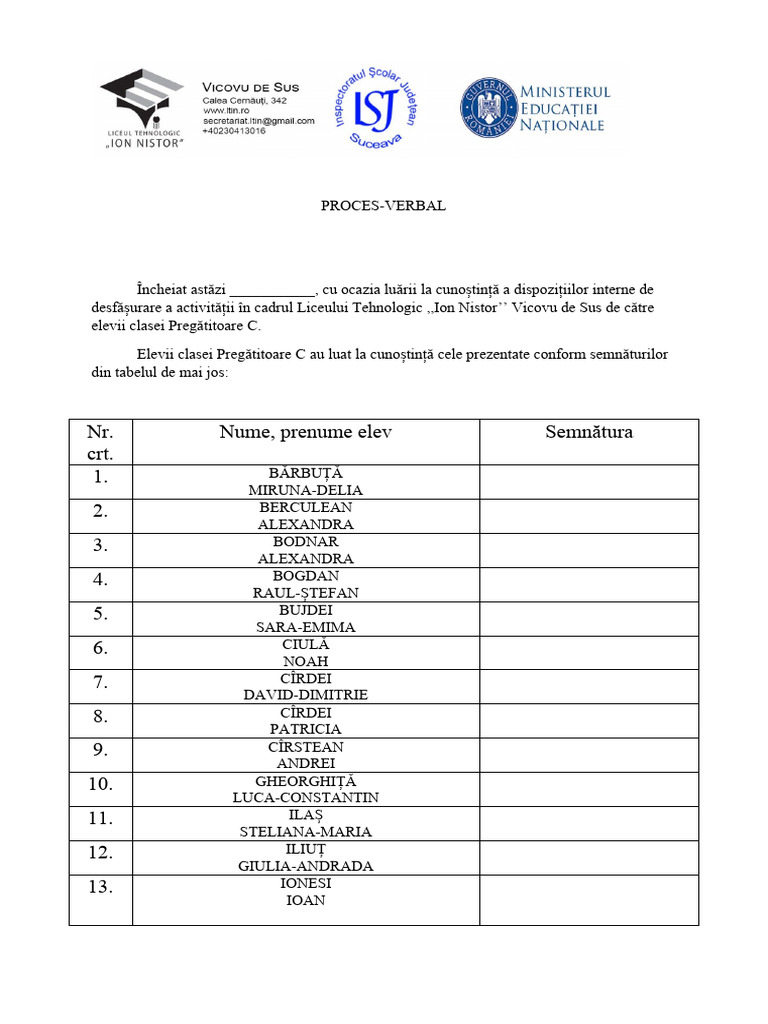 Încheiat astăzi ___________, cu ocazia luării la cunoștință a dispozițiilor interne de