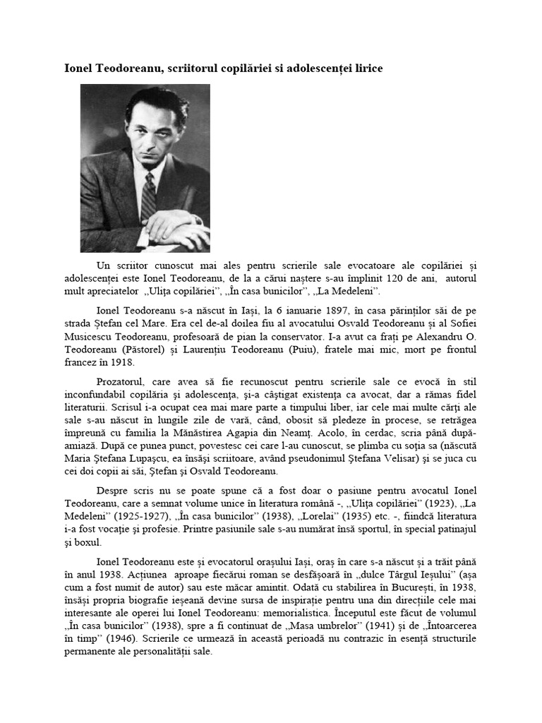 Teodoreanu, care a semnat volume unice în literatura română -, „Uliţa copilăriei” (1923), „La