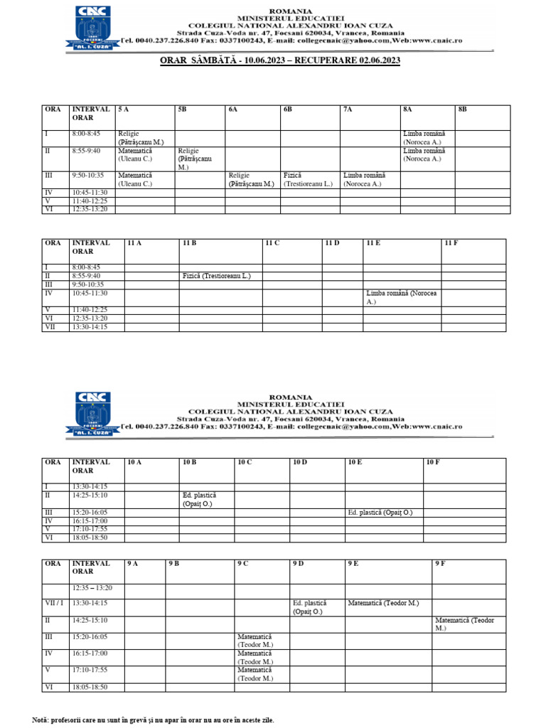 Notă: profesorii care nu sunt ȋn grevă și nu apar ȋn orar nu au ore ȋn aceste zile.