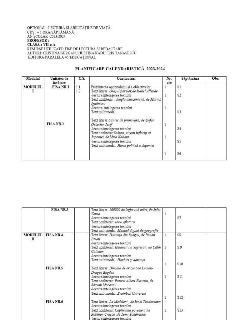 Modulul Unitatea de C.S. Conținuturi Nr. Săptămâna Obs.