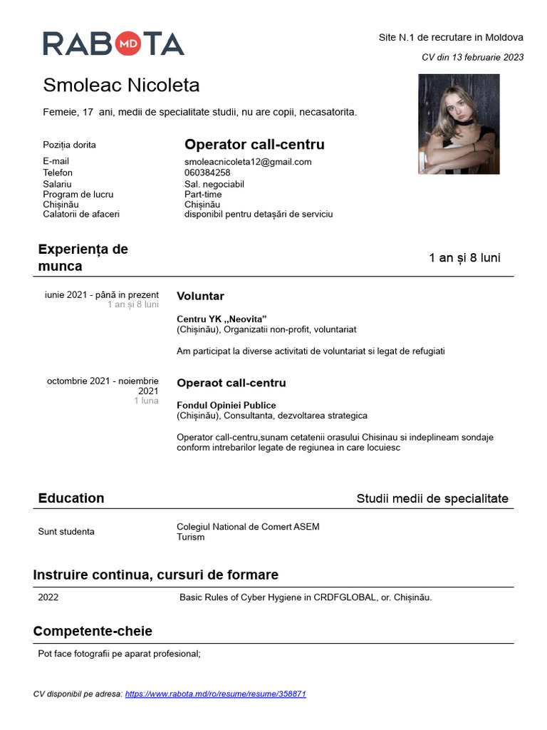 Operator call-centru,sunam cetatenii orasului Chisinau si indeplineam sondaje