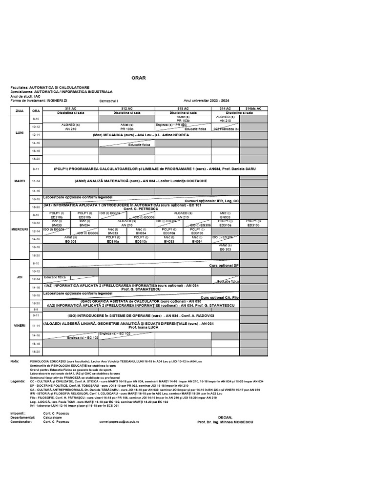 Forma de invatamant: INGINERI ZI Semestrul I Anul universitar 2023 - 2024