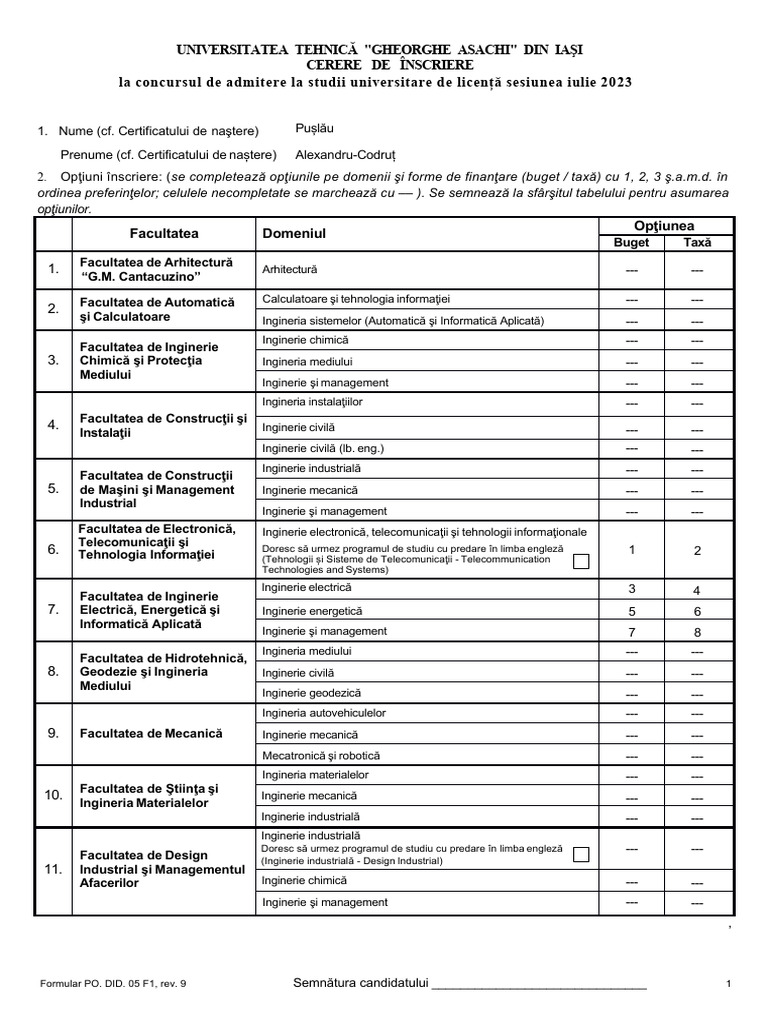 ordinea preferinţelor; celulele necompletate se marchează cu –– ). Se semnează la sfârşitul tabelului pentru asumarea