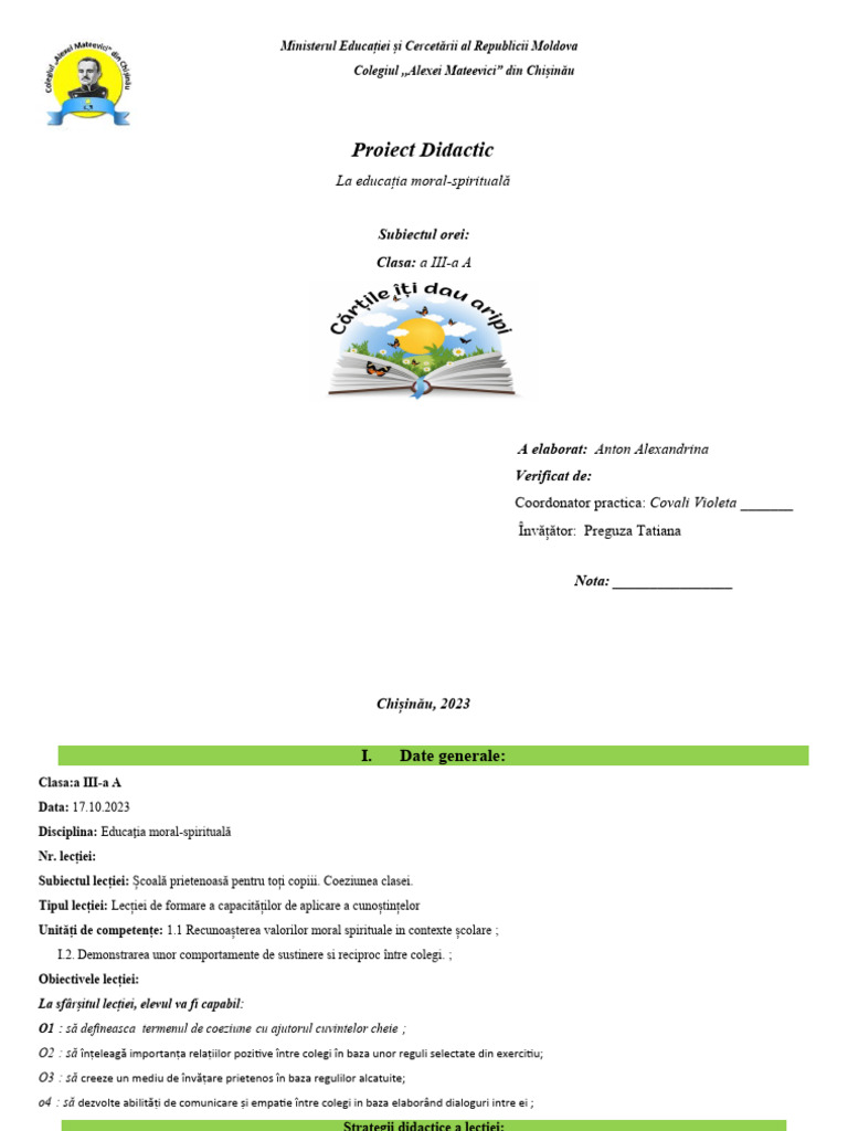 Unități de competențe: 1.1 Recunoașterea valorilor moral spirituale in contexte școlare ;