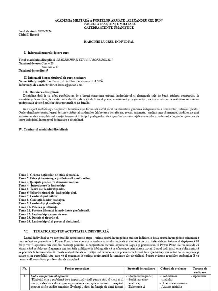 Titlul modulului/disciplinei: LEADERSHIP ȘI ETICCĂ PROFESIONALĂ
