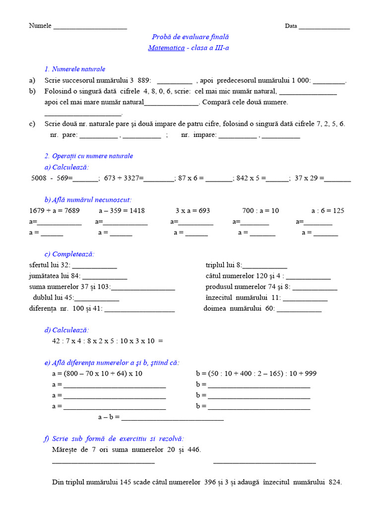 a) Scrie succesorul numărului 3 889: ___________ , apoi predecesorul numărului 1 000: __________.
