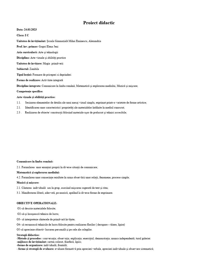 - forme și strategii de evaluare: evaluare formativă prin aprecieri verbale, aprecieri individuale și observare sistematică;