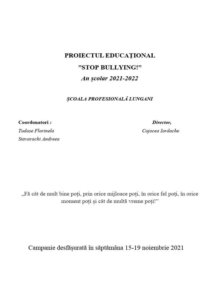 *Creşterea gradului de conştientizare a efectelor negative ale fenomenului "bullying" în rândul