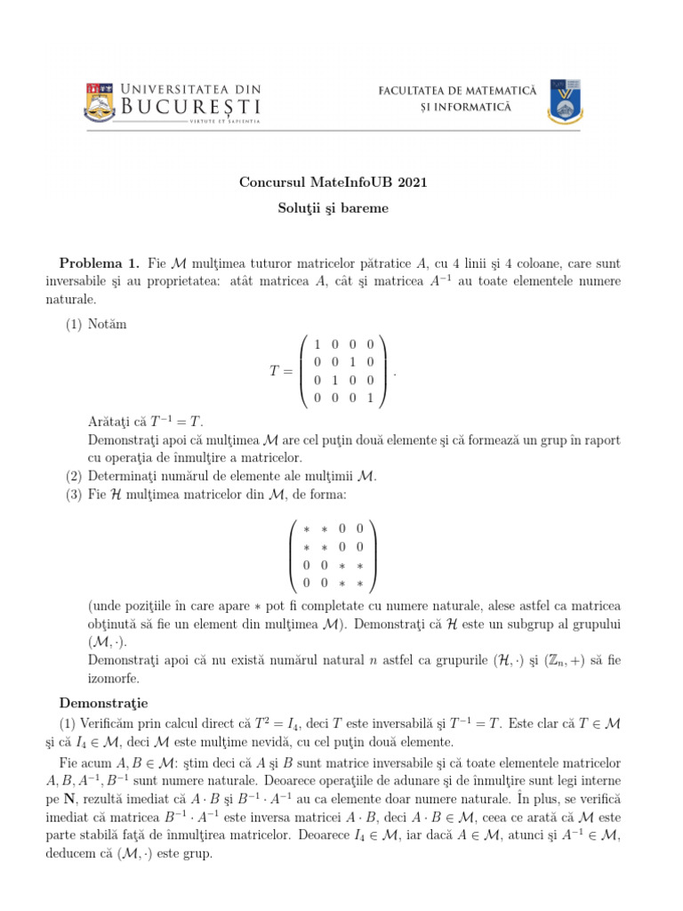 Problema 1. Fie M mulţimea tuturor matricelor pătratice A, cu 4 linii şi 4 coloane, care sunt