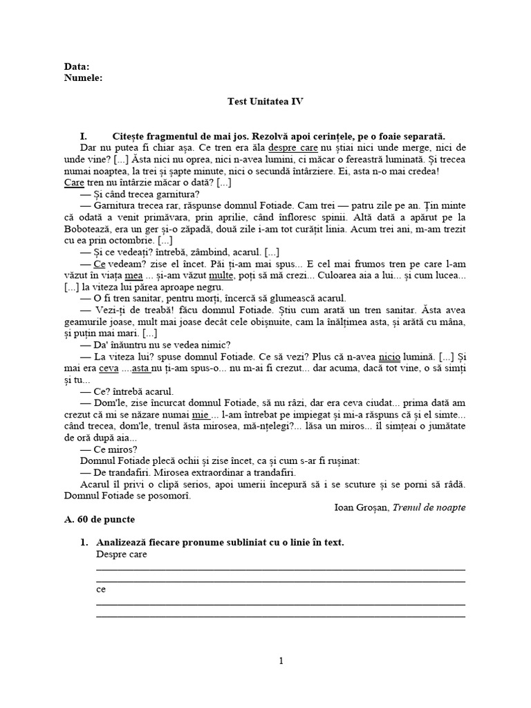 I. Citește fragmentul de mai jos. Rezolvă apoi cerințele, pe o foaie separată.