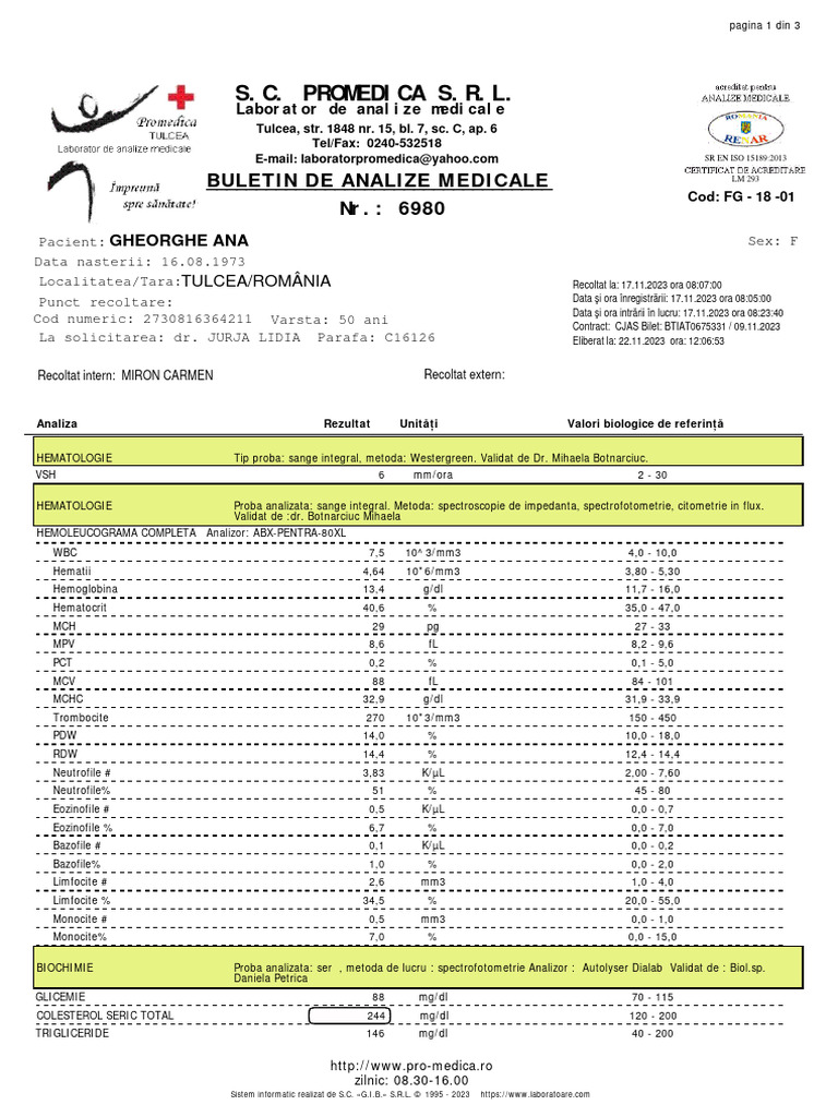 La solicitarea: dr. JURJA LIDIA Parafa: C16126 Eliberat la: 22.11.2023 ora: [Link]