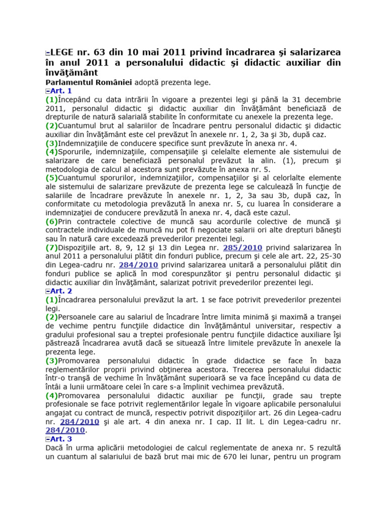 63 din 10 mai 2011 privind încadrarea şi salarizarea