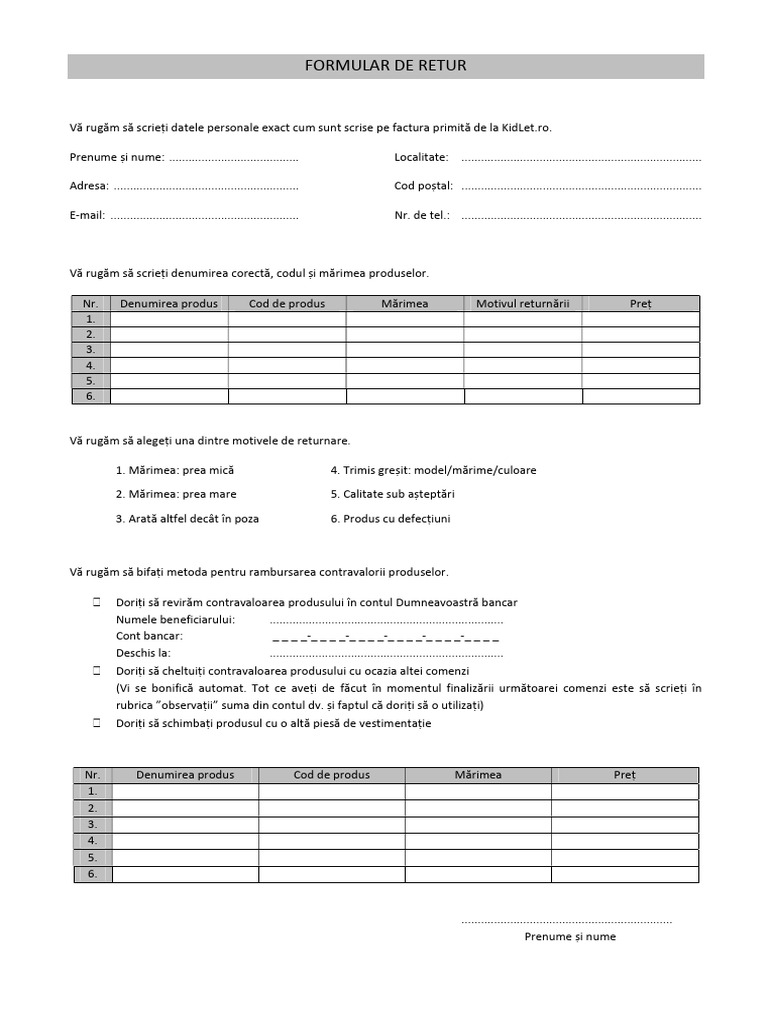 Nr. Denumirea produs Cod de produs Mărimea Motivul returnării Preț