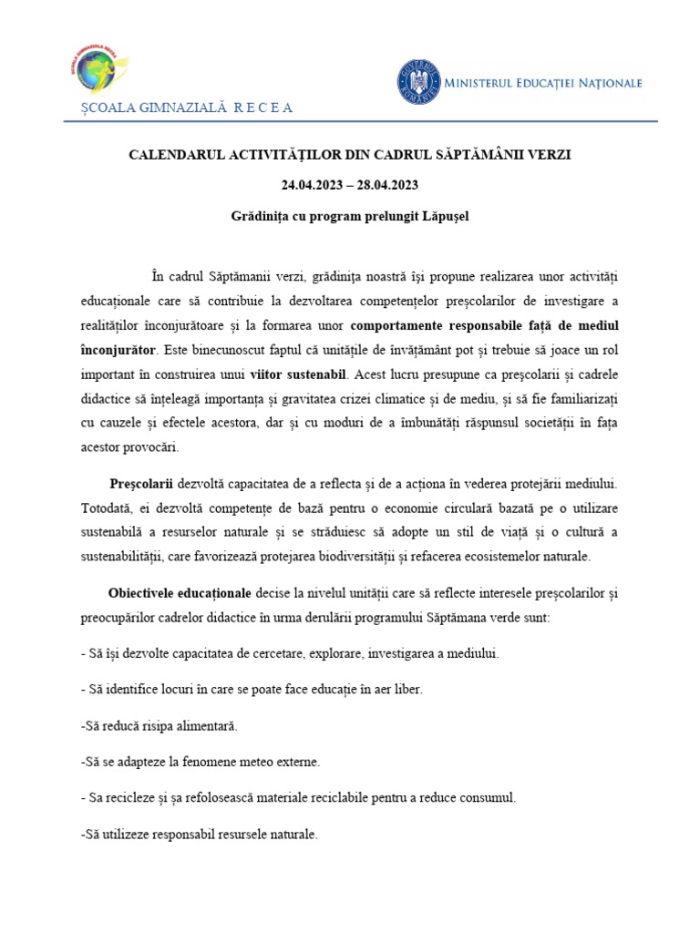 CALENDARUL ACTIVITĂŢILOR DIN CADRUL SĂPTĂMÂNII VERZI