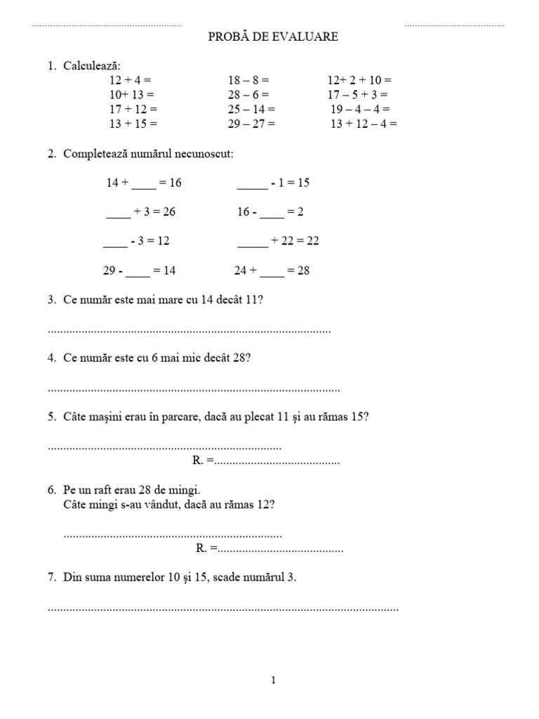 Competenţe: * efectuarea operaţiilor de adunare şi scădere în concentrul 0- 30;