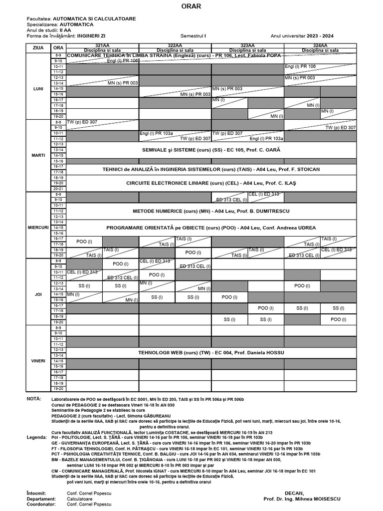 NOTĂ: Laboratoarele de POO se desfăşoară în EC S001, MN în ED 205, TAIS și SS în PR 506a și PR 506b
