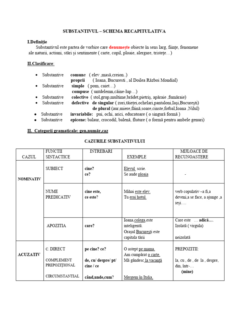 SUBSTANTIVUL – SCHEMA RECAPITULATIVA