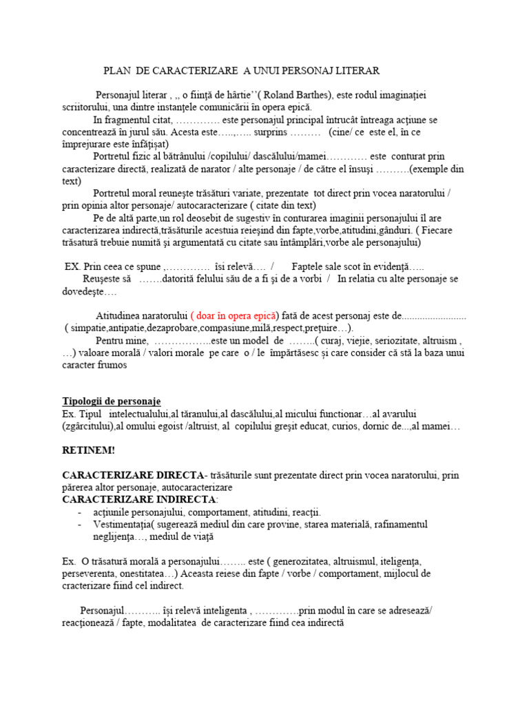 PLAN DE CARACTERIZARE A UNUI PERSONAJ LITERAR