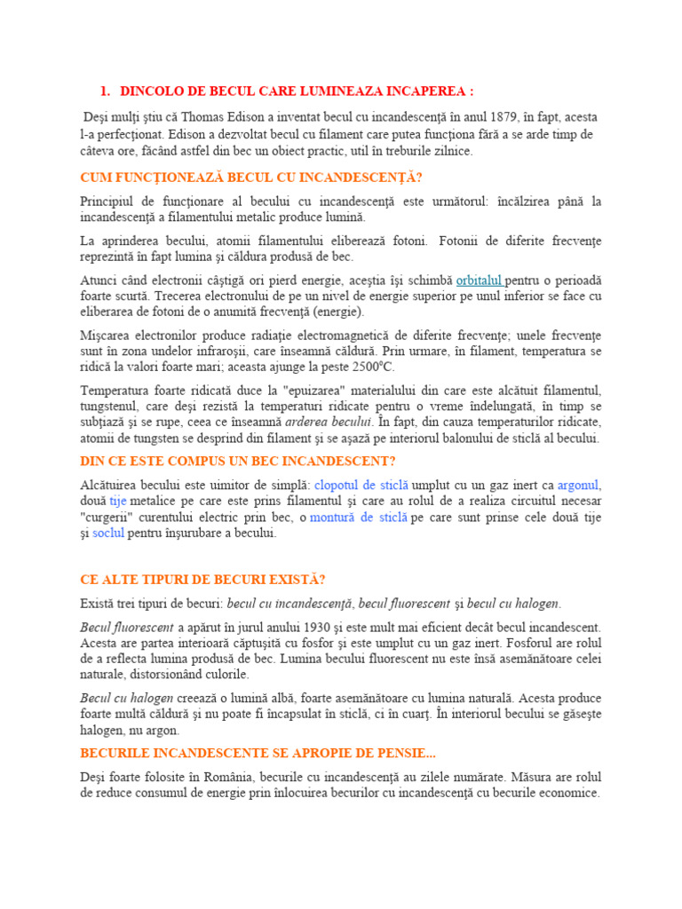 câteva ore, făcând astfel din bec un obiect practic, util în treburile zilnice.