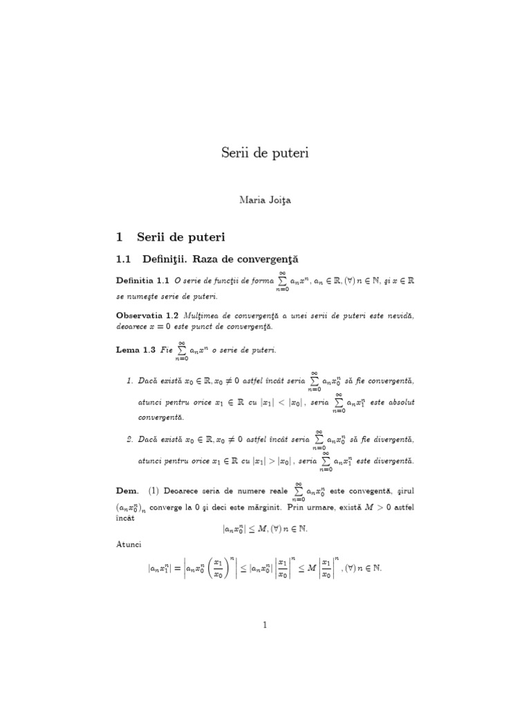 De…nitia 1.1 O serie de funcţii de forma an xn ; an 2 R; (8) n 2 N; şi x 2 R
