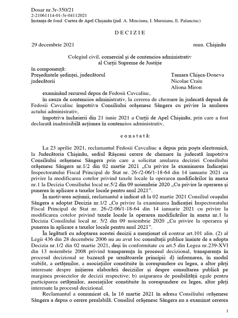 Fedosii Cavcaliuc împotriva Consiliului orășenesc Sângera cu privire la anularea
