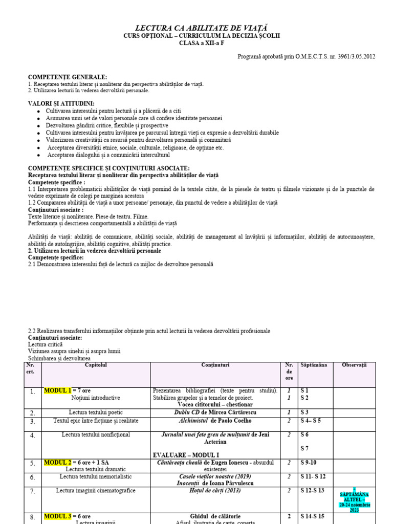 CURS OPȚIONAL – CURRICULUM LA DECIZIA ȘCOLII