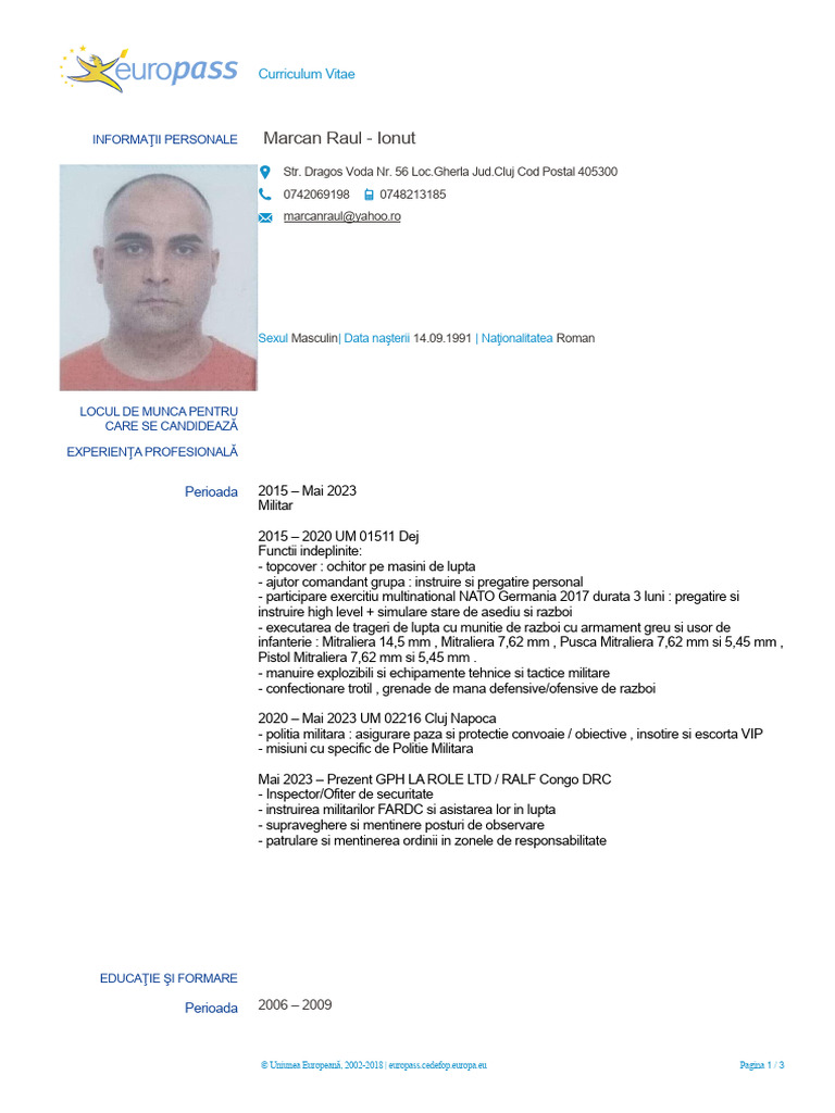 Sexul Masculin| Data naşterii 14.09.1991 | Naţionalitatea Roman