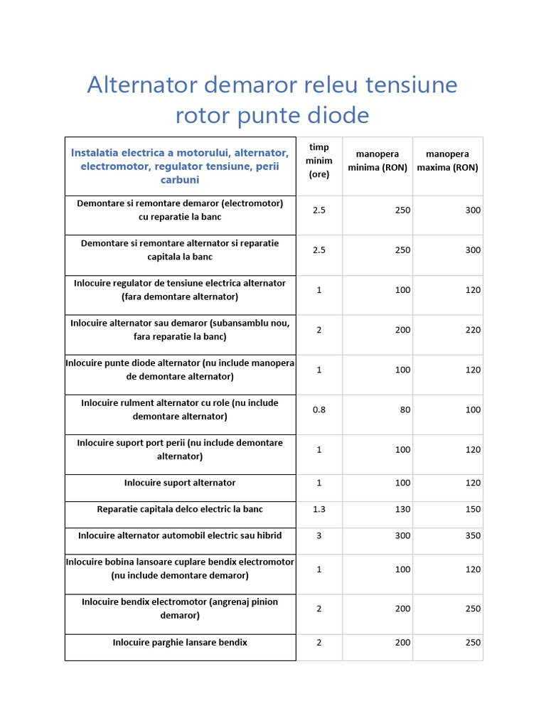 Pret manopera reparatie alternator, inlocuire