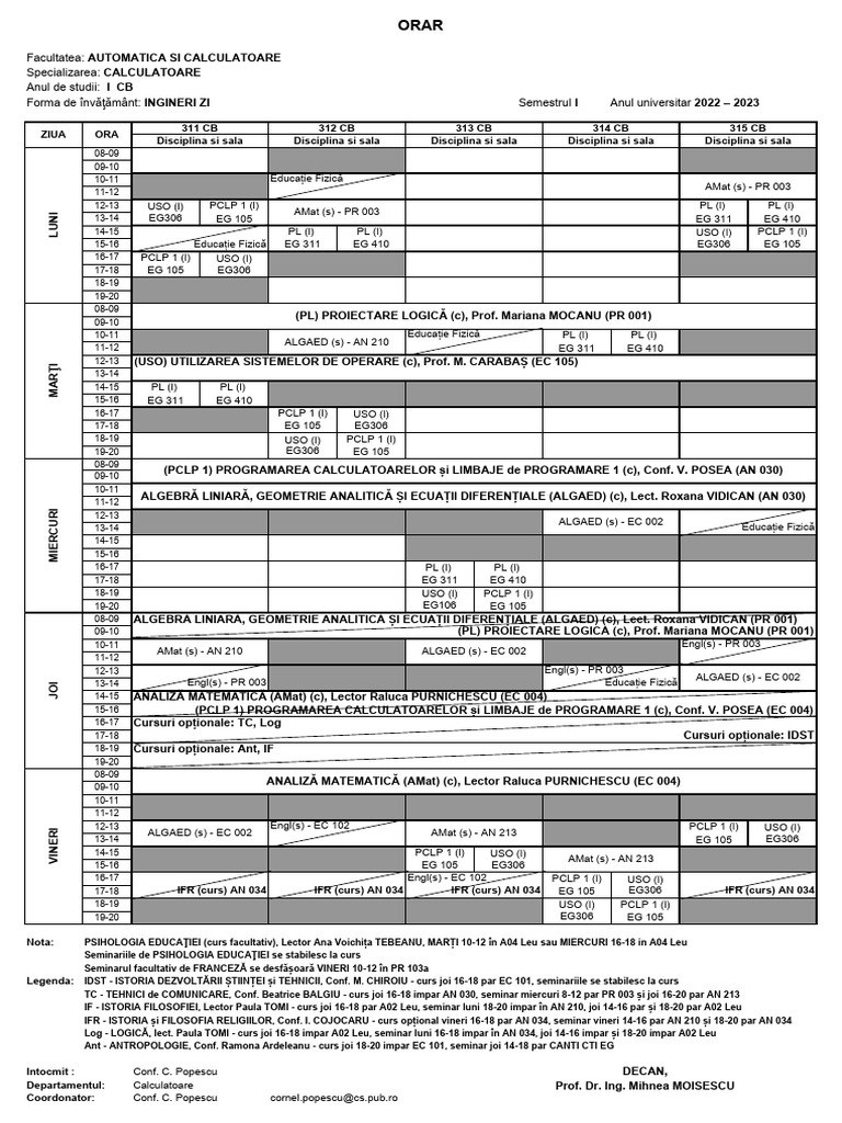 Forma de învăţământ: INGINERI ZI Semestrul I Anul universitar 2022 – 2023